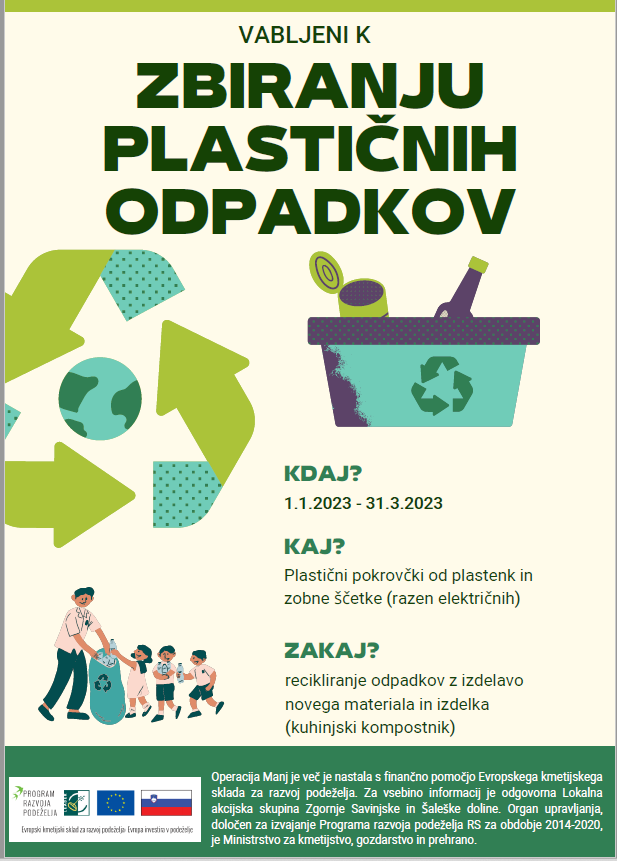 ponedeljek, 19. december 2022Iz odpadne plastike, ki nastaja v šolah ali doma, želimo narediti nov material ter iz njega izdelati omejeno serijo kuhinjskih kompostnikov. Glede na informacije, ki ste jih podali preko anketnih vprašalnikov, smo se dogovorili, da bi na osnovnih šolah zbirali plastične pokrovčke od plastenk in zobne ščetke (razen električnih). Ti odpadki imajo zaradi čistosti materiala in dobrih predelovalnih lastnosti pred drugimi bistveno prednost, saj je manj možnosti za morebitne napake ali deformacije produktov.